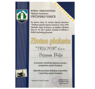 Zlatna plaketa „Trgovir d.o.o.“ 31.05.2017. Trgovir d.o.o. je dobitnik Zlatne plakete kao općinskog priznanja za izuzetno i odgovorno izvršavanje svih postavljenih zadataka, nesebičan doprinos u razvoju općine Gračanica i države Bosne i Hercegovine.